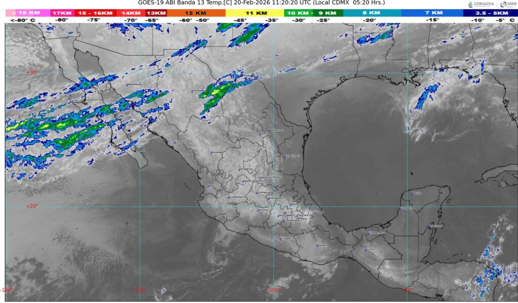 Por otra parte, se mantendrá el anticiclón en niveles medios de la atmósfera generando tiempo estable, con baja probabilidad de lluvia y ambiente vespertino cálido a caluroso en gran parte de la República Mexicana; prevalecerá la onda de calor en San Luis Potosí (centro), Querétaro (centro), Hidalgo (centro y suroeste), Jalisco (centro), Michoacán (suroeste) y Oaxaca (centro y oriente).